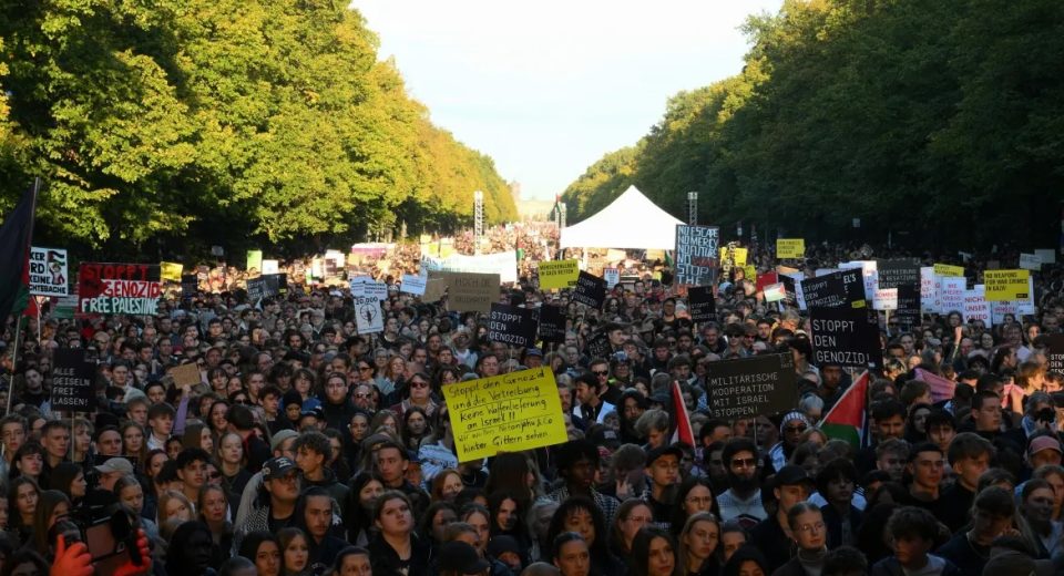 இஸ்ரேலுக்கான ஜெர்மனியின் ஆதரவை எதிர்த்து பெர்லினில் பல்லாயிரக்கணக்கானோர் பேரணி
