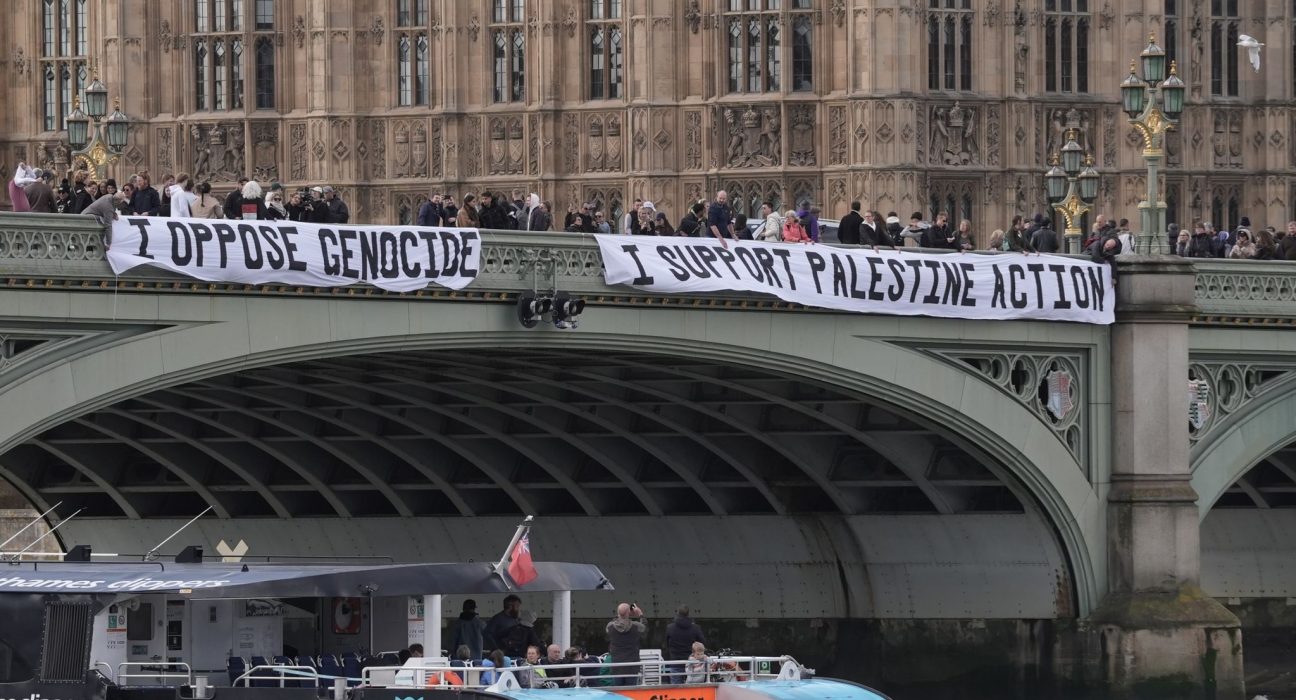ஆர்ப்பாட்டம் தொடங்குவதற்கு முன்பே, வெஸ்ட்மின்ஸ்டர் பாலத்தில் “நான் இனப்படுகொலையை எதிர்க்கிறேன்” மற்றும் “நான் பாலஸ்தீன நடவடிக்கையை ஆதரிக்கிறேன்” என்று எழுதப்பட்ட பதாகைகளை ஏந்தியதற்காக ஆறு பேர் கைது செய்யப்பட்டுள்ளனர்.