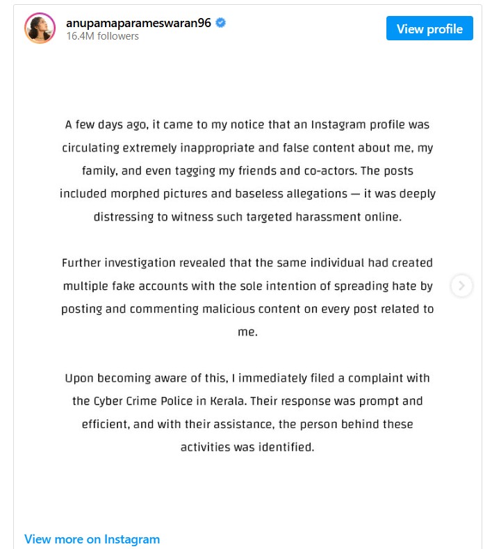 இது தொடர்பாக நடிகை அனுபமா பரமேஸ்வரன் தனது இன்ஸ்டாபக்கத்தில் வெளியிட்டுள்ள பதிவில்,