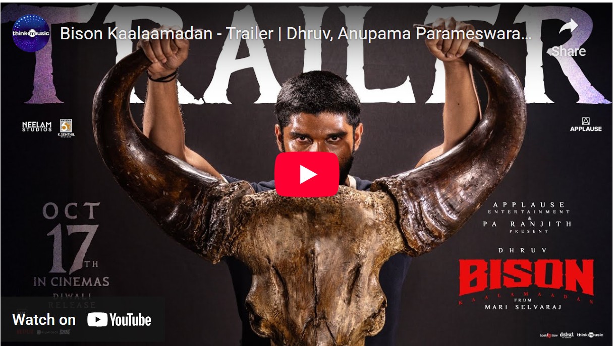 மாரி செல்வராஜ் இயக்கத்தில் துருவ் விக்ரம் நடித்த ‘பைசன்’ திரைப்படத்தின் ட்ரெய்லர் வெளியாகி உள்ளது.