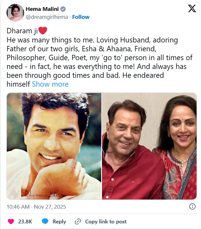 ஹேமமாலினி தனது கணவர் தர்மேந்திராவை நினைத்து ஒரு நீண்ட பதிவைப் பகிர்ந்துள்ளார்.