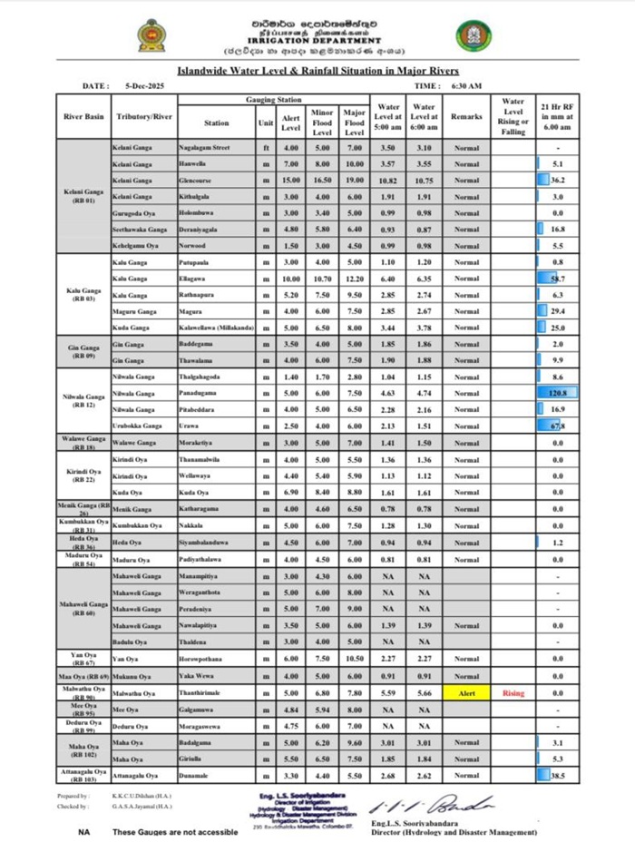 இன்று காலை 06.30 மணி நிலவரப்படி, இலங்கை முழுவதும் உள்ள மற்ற ஆறுகளின் நீர்மட்டம் சாதாரண மட்டத்தில் இருப்பதாக திணைக்களம் தெரிவித்துள்ளது.