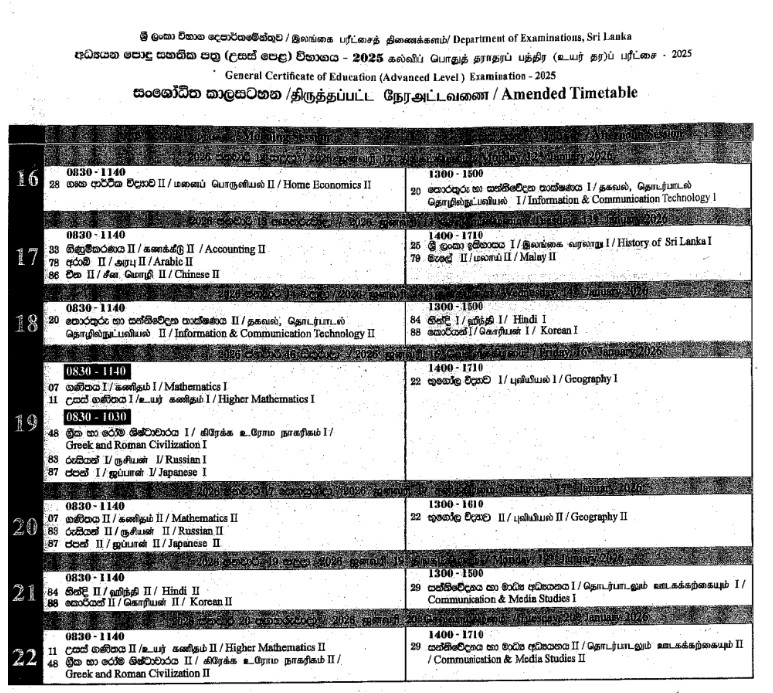 சீரற்ற வானிலை காரணமாக பிற்போடப்பட்டிருந்த 2025 க.பொ.த உயர்தரப் பரீட்சை பாடங்களுக்கான நேர அட்டவணை இன்று (10) வெளியிடப்பட்டது.