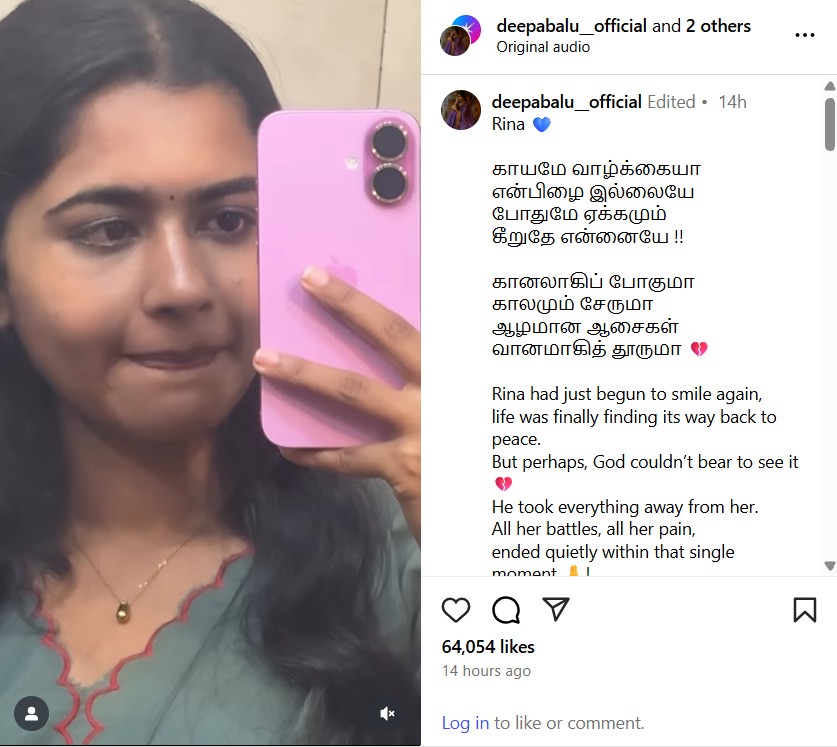 ரீனா கதாபாத்திரத்தில் நடிக்கும் நடிகை தீபா பாபுவின் இன்ஸ்டாகிராம் பதிவு, பார்ப்பவர்களின் நெஞ்சைப் பிழியும் வண்ணம் உள்ளது.