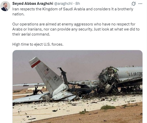 அமெரிக்க விமானப்படையின் சேதமடைந்த விமானம் போன்ற ஒரு புகைப்படத்தைப் தனது எக்ஸ் தளத்தில் பகிர்ந்துள்ள அவர், அமெரிக்காவின் வான்வழி கட்டளை மையத்தை ஈரான் அழித்துவிட்டதாகக் கூறியுள்ளார்.
