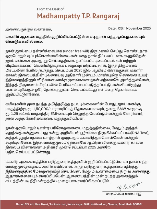 ஆனால் இன்று கதையே மாறி விட்டது. அதாவது நான் அப்படி கூறலே இல்லை” என்று மாதம்பட்டி ரங்கராஜன் ஒரு அறிக்கையை வெளியிட்டுள்ளார்.