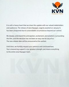 “கனத்த இதயத்துடன் இந்தத் தகவலைப் பகிர்கிறோம். எங்கள் கட்டுப்பாட்டையும் மீறிய சில தவிர்க்க முடியாத காரணங்களால், ஜனவரி 9-ம் தேதி வெளியாகவிருந்த ‘ஜனநாயகன்’ திரைப்படம் தள்ளிவைக்கப்படுகிறது. புதிய ரிலீஸ் தேதி விரைவில் அறிவிக்கப்படும்.”