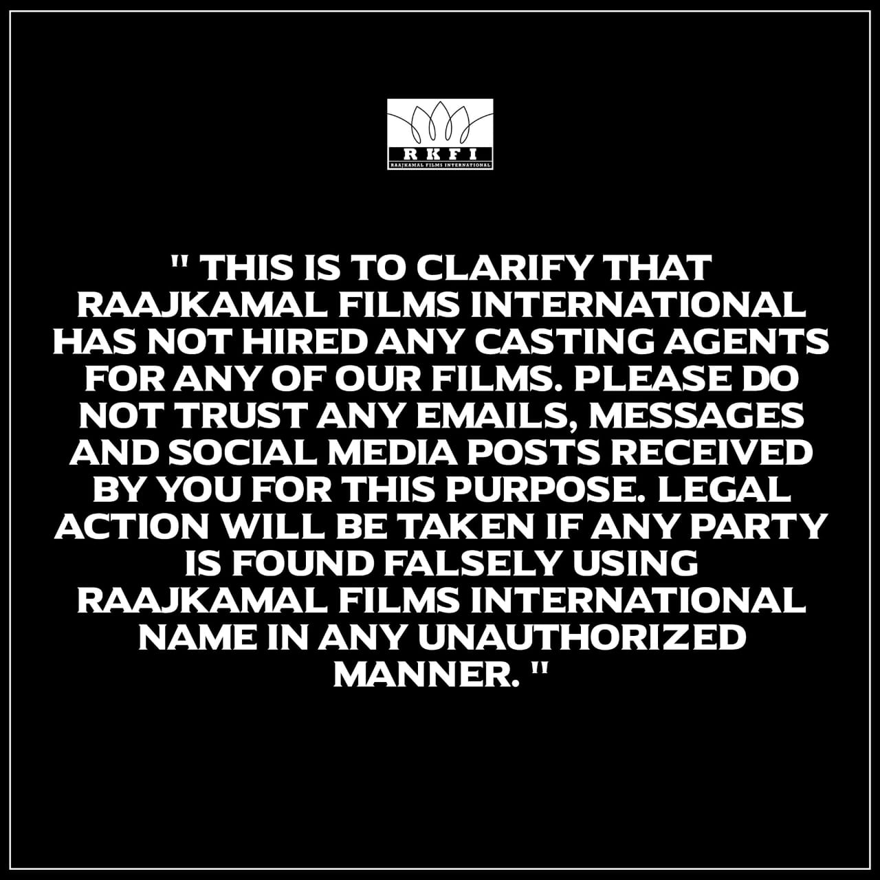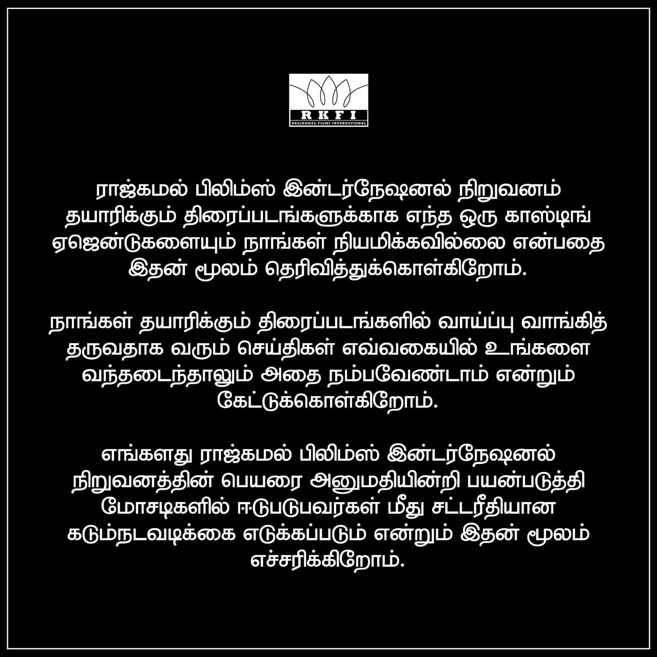 “ராஜ்கமல் பிலிம்ஸ் இன்டர்நேஷனல் நிறுவனம் தயாரிக்கும் திரைப்படங்களுக்காக எந்த ஒரு காஸ்டிங் ஏஜென்டுகளையும் நாங்கள் நியமிக்கவில்லை என்பதை இதன் மூலம் தெரிவித்துக்கொள்கிறோம்.