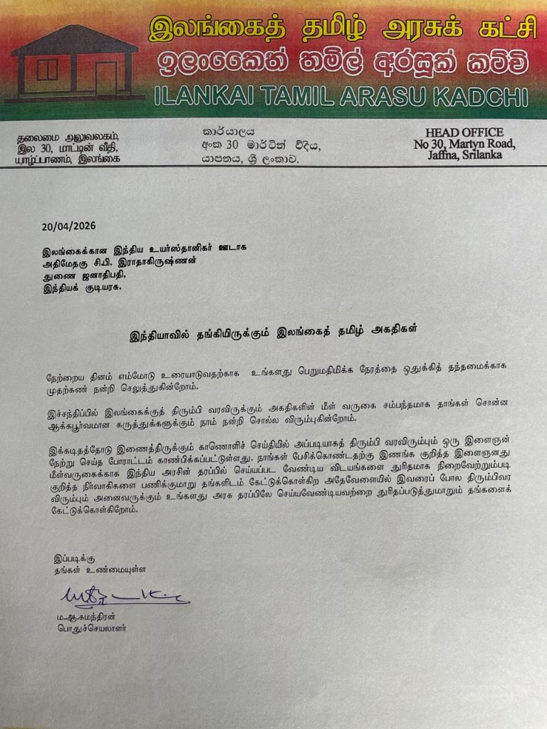 இந்தியாவில் தங்கியிருக்கும் இலங்கைத் தமிழ் அகதிகளின் மீள் வருகை மற்றும் அது தொடர்பான நடைமுறைகளைத் துரிதப்படுத்துமாறு கோரி, இலங்கைத் தமிழரசுக் கட்சியின் பொதுச்செயலாளர் எம்.ஏ. சுமந்திரன், இந்தியத் துணை ஜனாதிபதி சி.பி. இராதாகிருஷ்ணனுக்கு அவசர கடிதமொன்றை அனுப்பியுள்ளார்.