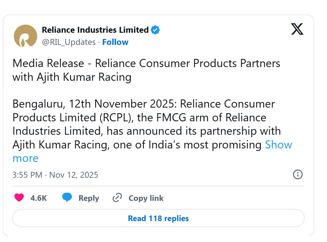 இந்திய தொழிலதிபர் முகேஷ் அம்பானிக்கு சொந்தமான ரிலையன்ஸ் கன்ஸ்யூமர் புராடக்ட்ஸ் நிறுவனம் (Reliance Consumer Products) நடிகர் அஜித் குமாரின் கார் பந்தயக் குழுவுடன் இணைந்துள்ளது.