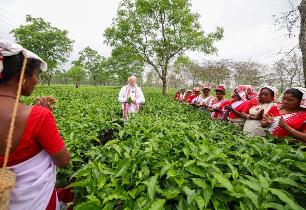 இந்தியா, அசாமின் திப்ருகரில் அமைந்துள்ள தேயிலை தோட்டமொன்றுக்கு பிரதமர் மோடி சென்றிருந்தார். அவர் அங்கு தேயிலைத் தோட்ட தொழிலாளர்களுடன் கலந்துரையாடினார்.