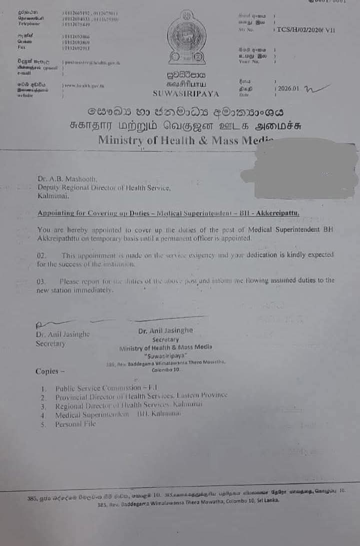 இது தொடர்பில் வெளியிடப்பட்டுள்ள அறிக்கையில், ‘குற்றச்சாட்டுகளுக்கு உள்ளாகியிருந்த அக்கரைப்பற்று ஆதார வைத்தியசாலையின் வைத்திய அத்தியட்சகரை உடனடியாக அந்தப் பதவியிலிருந்து நீக்குவதற்கான கடிதத்தை சுகாதார அமைச்சின் செயலாளர் வெளியிட்டுள்ளார்.
