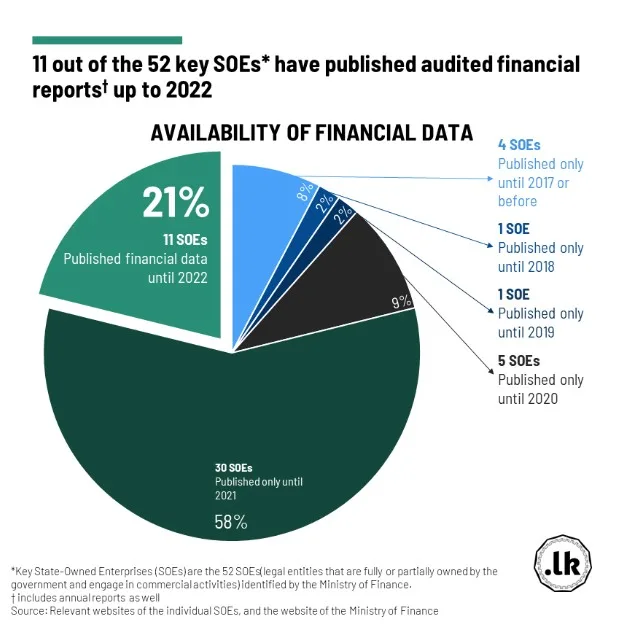 இலங்கையில் உள்ள 52 பிரதான அரச நிறுவனங்களில் 41 நிறுவனங்கள் 2022 ஆம் ஆண்டு வரை வருடாந்த நிதி அறிக்கைகளை வெளியிடவில்லை என ஆய்வு நிறுவனம் ஒன்று தெரிவித்துள்ளது.