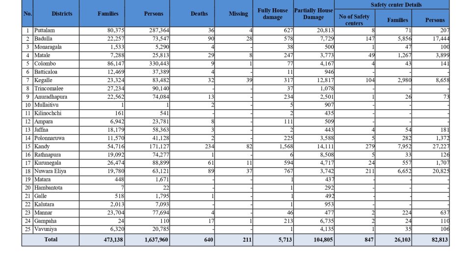 டித்வா புயல் மற்றும் அதைத் தொடர்ந்து ஏற்பட்ட வெள்ளம் மற்றும் நிலச்சரிவுகளால் இலங்கையில் உயிரிழந்தவர்களின் எண்ணிக்கை 640 ஆக அதிகரித்துள்ளது. அனர்த்த முகாமைத்துவ மத்திய நிலையம் இன்று (12 ) மதியம் வெளியிட்டுள்ள அறிக்கையில் இந்த விடயம் தெரிவிக்கப்பட்டுள்ளது. 211 பேரை காணவில்லை என பட்டியலிடப்பட்டுள்ளது. 5 ஆயிரத்து 713 வீடுகள் முழமையாகவும், ஒரு லட்சத்து 4 ஆயிரத்து 805 வீடுகள் பகுதியளவும் சேதம் அடைந்துள்ளன என்று மேற்படி அறிக்கையில் குறிப்பிடப்பட்டுள்ளது. 26 ஆயிரத்துக்கு மேற்பட்ட குடும்பங்கள் […]
