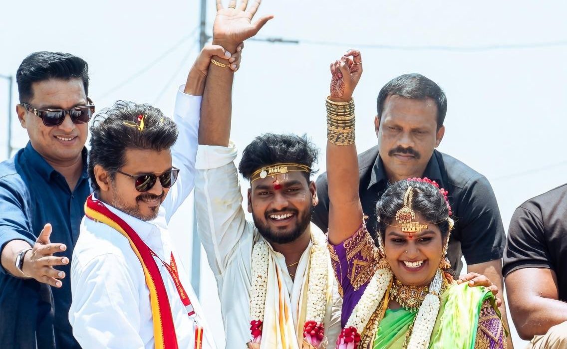 தமிழக வெற்றிக் கழகத் தலைவர் விஜய் தனது காரில் மணமக்களை நேரில் அழைத்து வாழ்த்திய காணொளி சமூக வலைதளங்களில் வைரலாகி வருகிறது.