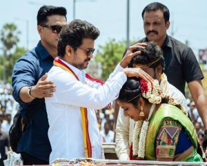 வாக்குச் சேகரிப்பில் ஈடுபட்ட தமிழக வெற்றிக் கழகத் தலைவர் விஜய் அப்போது, அந்த வழியாக வந்த மணமக்கள் இருவரைத் தனது பரப்புரை வாகனத்திற்குள்ளேயே அழைத்து வாழ்த்தியுள்ளார்.