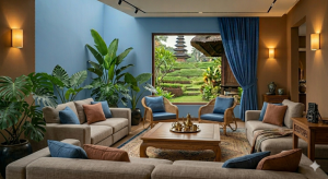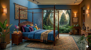 வெளிச்சம்: மஞ்சள் நிற விளக்குகள் (Warm lights) இந்த நீல நிறத்தோடு சேரும்போது, அறைக்கு ஒரு வசதியான மற்றும் ராஜரீகமான தோற்றத்தைத் தரும்.