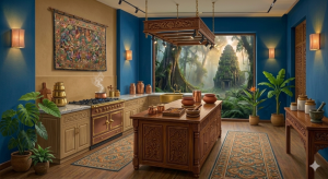 பொருத்தமான நிறங்கள்மெல்லோ ப்ளோ நீலத்துடன், மண் சார்ந்த நிறங்கள் (Earthy tones) மற்றும் மென்மையான செம்பு நிறங்கள் (Soft Copper).அலங்காரப் பொருட்கள்மரத்தாலான மேசைகள், கைவினைப் பொருட்கள் மற்றும் இயற்கை நாரினால் ஆன விரிப்புகள். நோக்கம் டிஜிட்டல் உலகின் சத்தத்திலிருந்து விலகி, வீட்டிற்குள் ஒரு அமைதியான உலகத்தை உருவாக்குவது.