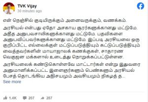 தமிழக தேர்தலில் பெரும் எதிர்ப்பார்ப்பை ஏற்படுத்தியுள்ள தமிழக வெற்றிக் கழகத்தின் தலைவர் விஜய் சற்று முன்னர் அவர் தன் முகநூல் பக்கத்தில் நன்றி தெரிவித்து பதிவிட்டுள்ளார்.